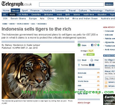 Dalam tajuknya yang dipublish tanggal 21 Januari 2010, The Telegraph menyebutkan, Pemerintah Indonesia berencana untuk memperdagangkan Harimau Sumatera dengan dalih untuk melestarikannya dari kepunahan. Untuk sepasang Harimau Sumatra (Panthera tigris sumatrae) pemerintah memberikan harga sekitar Rp 1 Miliar.