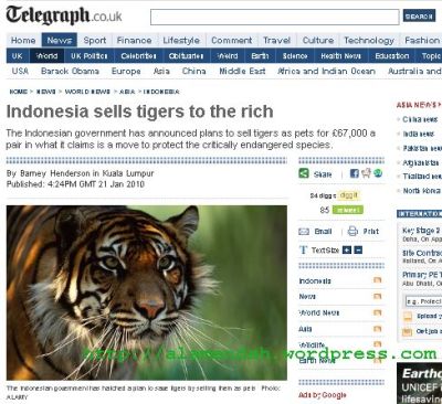 Informasi ini saya peroleh dari komentar sobat Ruanghati yang memberikan link postingan terbarunya tentang rencana perdagangan Harimau Sumatera. Kaget dan setengah tidak percaya karena di dalam negeri sendiri, rencana ini sama sekali tidak terdengar. Namun setelah membaca postingan dan menelusuri ke situs The Telegraph, saya jumpai sebuah tajuk berjudul “Indonesia sells tigers to the rich” jelas tertuliskan “The Indonesian government has announced plans to sell tigers as pets for £67,000 a pair in what it claims is a move to protect the critically endangered species.”