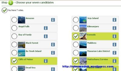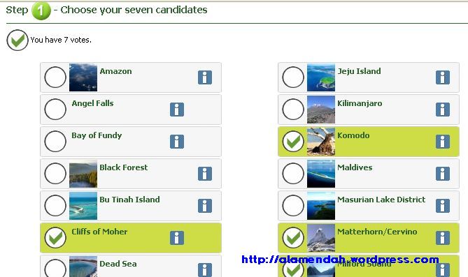 - Kunjungi situs www.new7wonders.com, pilih NEW7WONDERS > New7Wonders of Nature > NewNew7Wonders of Nature. Atau klik http://www.new7wonders.com/community/en/new7wonders/new7wonders_of_nature/voting;