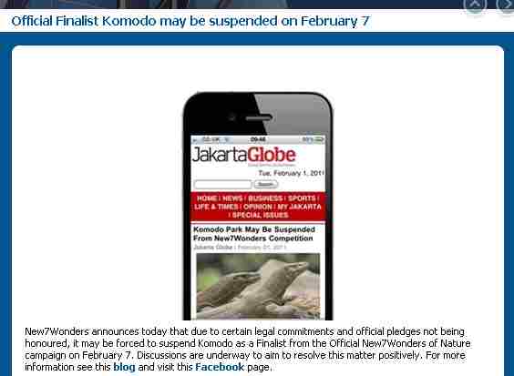 Pulau Komodo akan dicoret dari finalis New 7 Wonders pada 7 Februari mendatang. Berita mengejutkan tentang penangguhan Taman Nasional Komodo dalam pemilihan 7 keajaiban dunia ini diumumkan langsung oleh ‘The New7Wonders Foundation‘ di situsnya pada 31 Januari lalu.