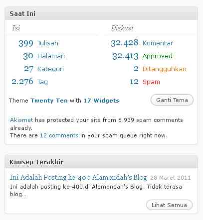 Ini adalah posting ke-400 di Alamendah’s Blog. Tidak terasa blog ini telah mencapai 400 buah artikel ditandai dengan dipublishnya post ini. 400 buah artikel ini ditulis dalam kurun waktu sekitar 22,5 bulan. Artinya rata-rata Alamendah’s Blog mampu mem-publish sekitar 18 artikel setiap bulannya.