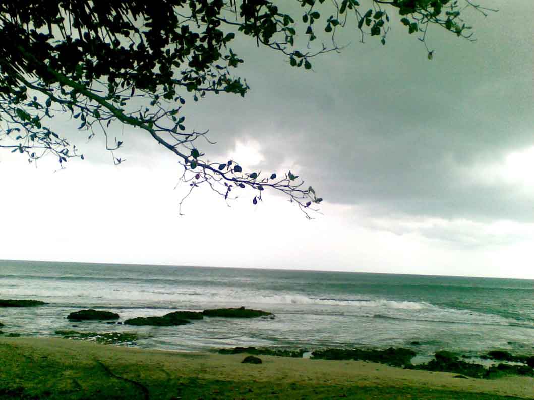 Saat memasuki kawasan pantai selatan, cuaca mulai mendung. Kami menggeber motor dengan cukup cepat di tengah jalan yang cukup lengang itu. Angin pantai terasa sangan kencang menerpa tubuh kami. Tanpa terasa, kami sudah sampai di gerbang obyek wisata pantai Santolo, Pameungpeuk, Garut. Tadinya kami hendak masuk kesana, tapi urung karena kami sudah beberapa kali ke pantai itu.
