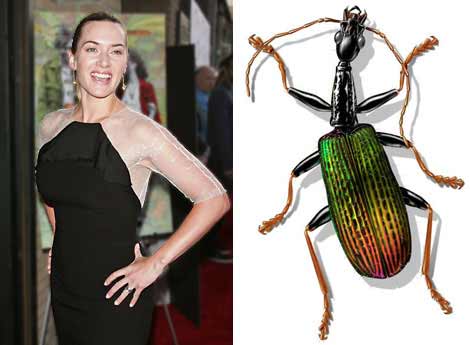 • Kumbang Kate Winslet: Artis cantik ini dijadikan nama kumbang dengan nama latin Agra katewinsletae, setelah bermain dalam film Titanic. Terry Erwin, ahli serangga yang menemukan serangga ini, menjelaskan, pemberian nama mengacu pada ancaman punahnya serangga karena deforestasi. Harapannya, kumbang ini tidak ikut punah sebagaimana Kate Winslet yang tidak tenggelam bersama kapal Titanic.