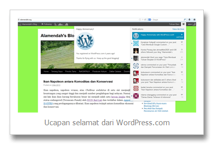 Baru sempat membuka blog Alamendah dan langsung dibuat kaget dengan sebuah notifikasi dari WordPress.com. “Happy Anniversary! You registered on WordPress.com 4 years ago!”. Dan baru tersadarkan bahwa hari ini, 12 Mei 2013, blog Alamendah genap berusia 4 tahun.
