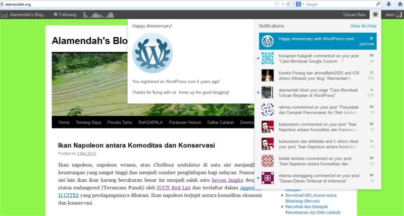 Baru sempat membuka blog Alamendah dan langsung dibuat kaget dengan sebuah notifikasi dari WordPress.com. “Happy Anniversary! You registered on WordPress.com 4 years ago!”. Dan baru tersadarkan bahwa hari ini, 12 Mei 2013, blog Alamendah genap berusia 4 tahun.
